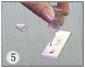 在加入血液后2秒鐘后,加入1滴緩沖液,防止血液凝固。血樣和緩沖液加入后即可看到擴(kuò)散反應(yīng),會(huì)慢慢流過觀察區(qū)。 一般5分鐘后,混合液已流入觀察區(qū)(檢測(cè)區(qū)和對(duì)照區(qū))。流動(dòng)中的紅暈是正常現(xiàn)象。(圖5)