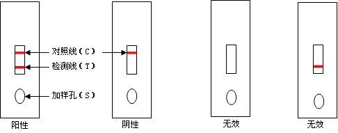 4. 失效:在觀察孔內(nèi),對(duì)照線區(qū)(C)和檢測(cè)線區(qū)(T)都不出現(xiàn)色線;或僅檢測(cè)線區(qū)(T)出現(xiàn)色線。