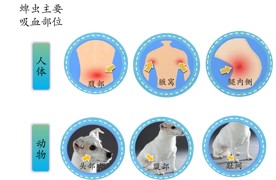 蜱蟲的一生需要經(jīng)歷卵、幼蟲、若蟲和成蟲四個(gè)階段,幼蟲吸血后發(fā)育為若蟲,若蟲吸血后發(fā)育為成蟲,而成蟲也要吸血后才可產(chǎn)卵,所以吸血是蜱蟲一生孜孜不倦的追求(除極少數(shù)種外)。蜱蟲還是一種非常聰明的生物,它會對宿主的寄生部位進(jìn)行選擇,一般會在皮膚較薄、不易被觸碰到的部位寄生,如人和動物的頸部、耳后、腋窩、腰腹部、腿內(nèi)側(cè)以及動物趾間等。