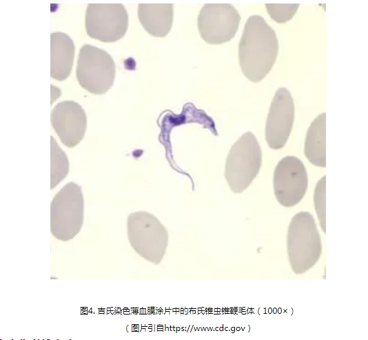 三是實(shí)驗(yàn)室檢查病人血清中布氏錐蟲抗體是否陽性,病人血液、淋巴液、下疳抽吸液、骨髓穿刺液或腦脊液鏡檢中是否查見布氏錐蟲錐鞭毛體(如圖4),或布氏錐蟲核酸檢測陽性。