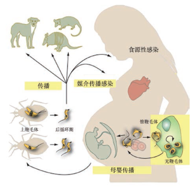 恰加斯病主要經(jīng)“接吻蟲”錐蝽傳染(圖 2),錐蝽夜間吸血時,不會直接通過唾液傳播,而是將含有克氏錐蟲的糞便排泄在人體皮膚上。當(dāng)人被叮咬后抓撓,寄生蟲通過傷口或黏膜(如眼、口)侵入體內(nèi)??耸襄F蟲也可以通過輸血、器官移植和垂直傳播(母嬰傳播)。另外,亦可通過實驗室意外感染發(fā)病,食用受污染的食物或飲料傳播。(如圖3)